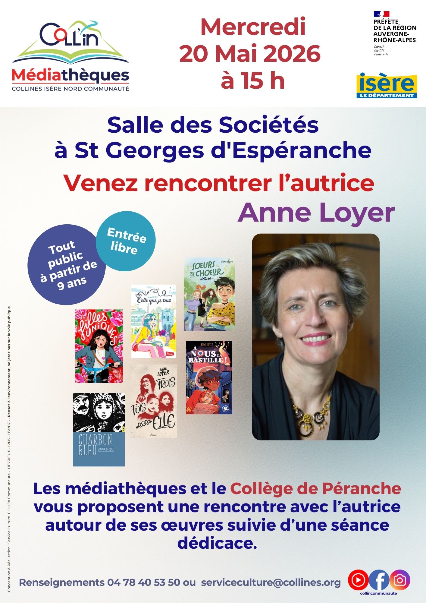 En partenariat avec le réseau des Médiathèques Coll'In Nord Communautés, les élèves du club lecture rencontreront l’autrice de littérature jeunesse Anne Loyer le Mercredi 20 Mai 2026 à partir de 15h00 à la salle des sociétés de Saint-Georges-d’Espéranche (à côté de la médiathèque). Lors de cette rencontre ouverte à tout public, les élèves proposeront une animation avant de laisser place à l’échange avec l’autrice. Un temps consacré aux dédicaces sera proposé.